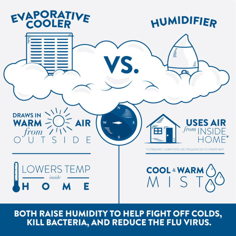 Unlike evaporative coolers, humidifiers work with the air inside your home, so there is no need to open windows, but like swamp coolers, humidifiers help purify your air, as well as add moisture to your indoor environment. This is especially beneficial during winter months, when dry, cold air makes it harder to maintain indoor humidity levels.
